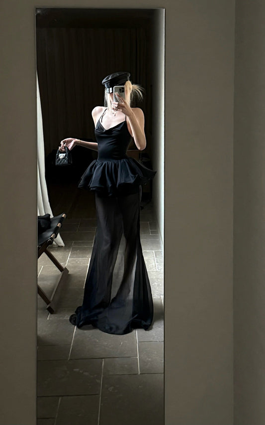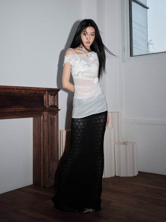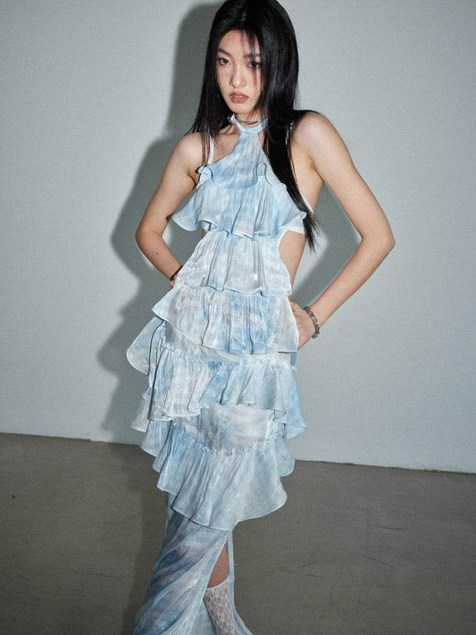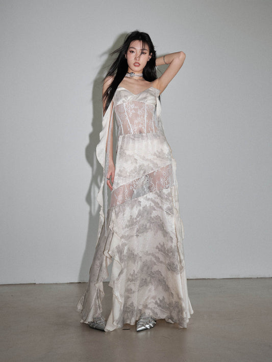 Sheer Lace Dual Fabric Ruffled Maxi Dress