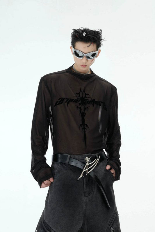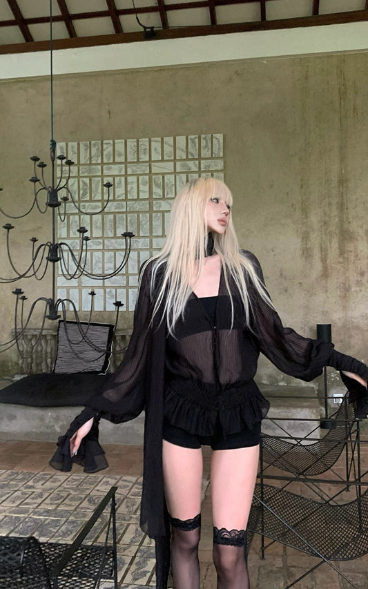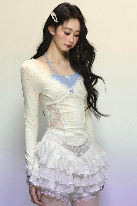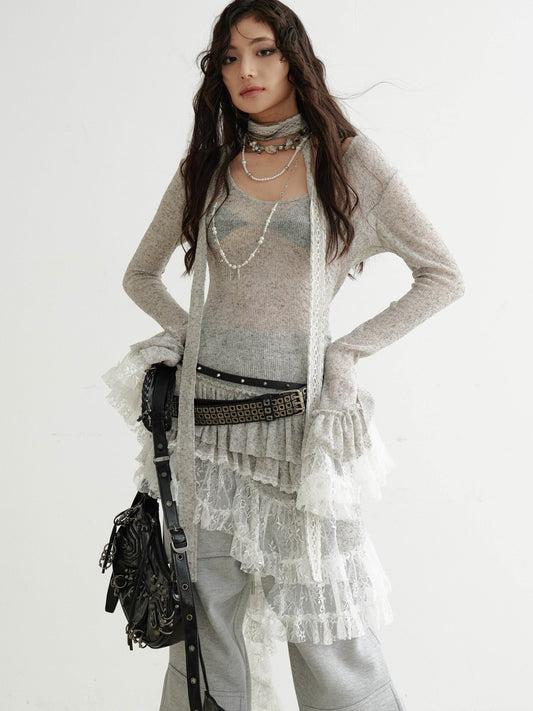 Sheer Knit Top With Asymmetric Ruffled Lace Hem