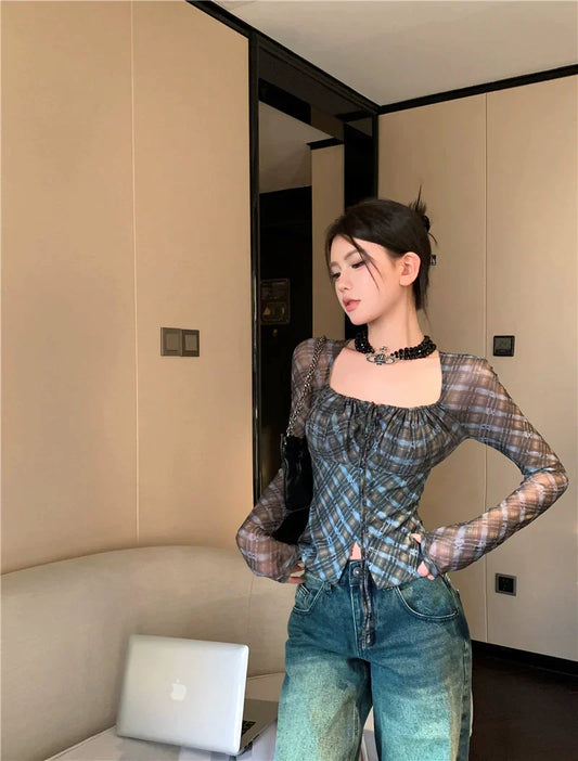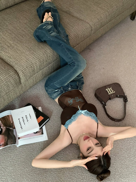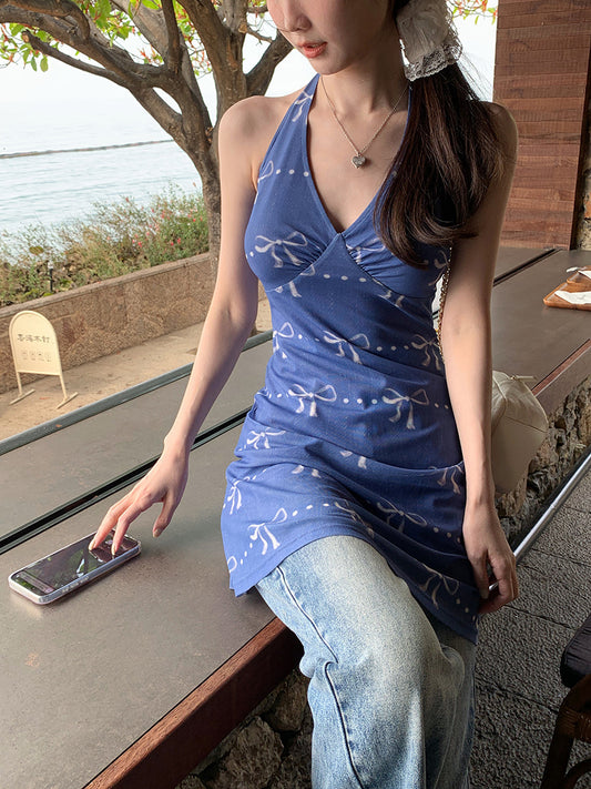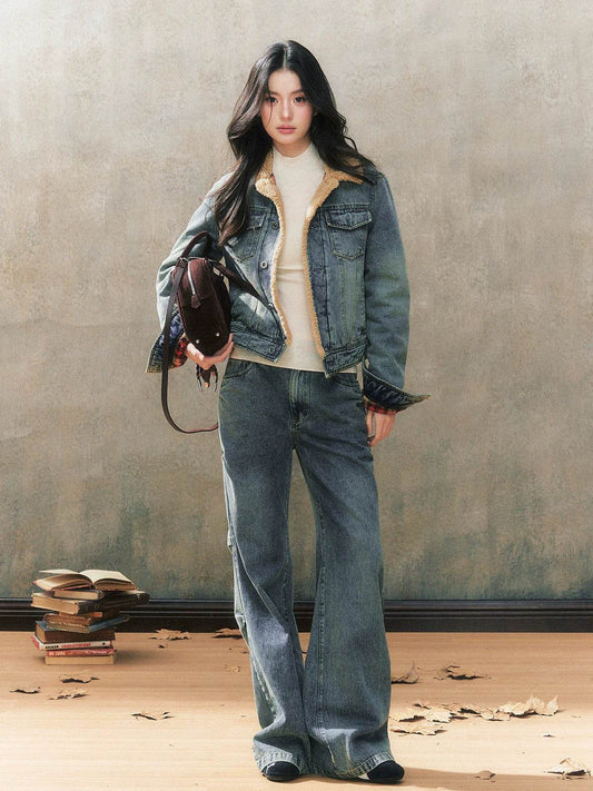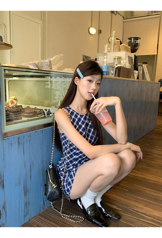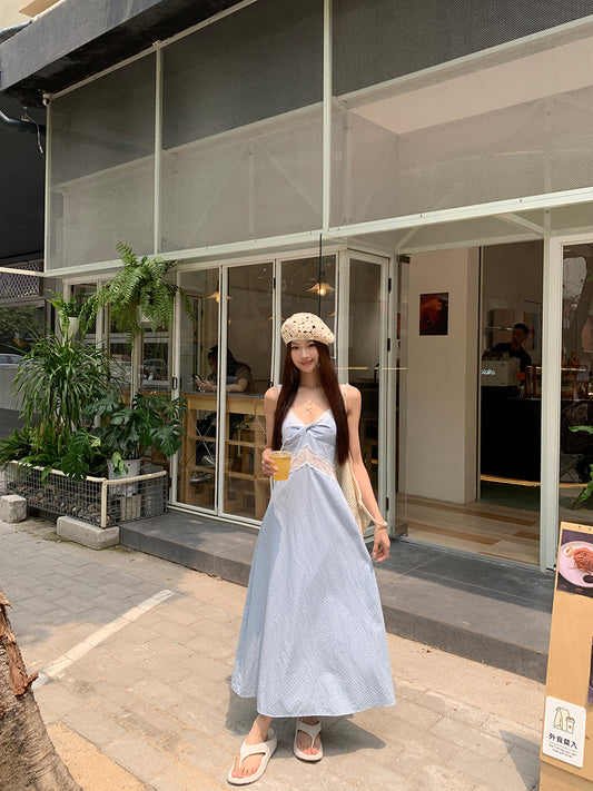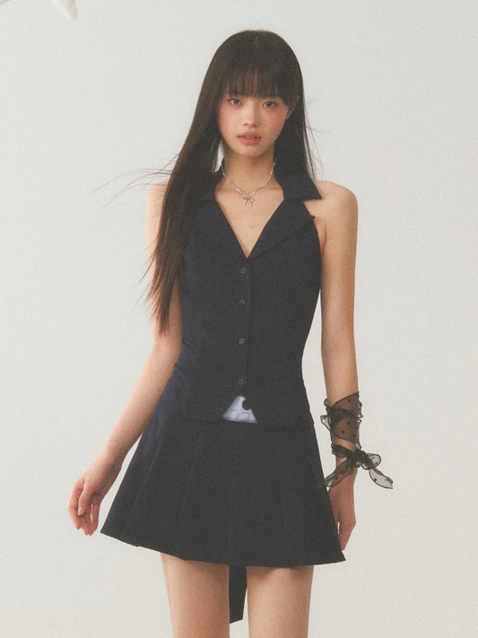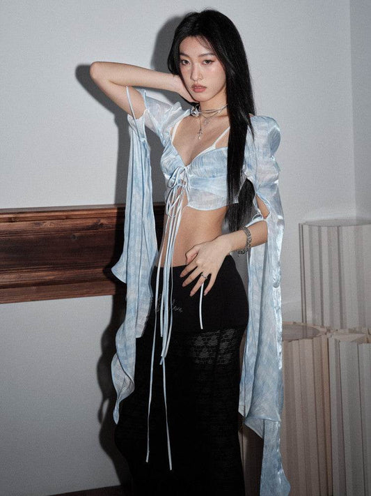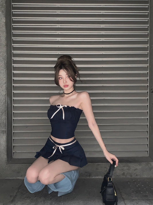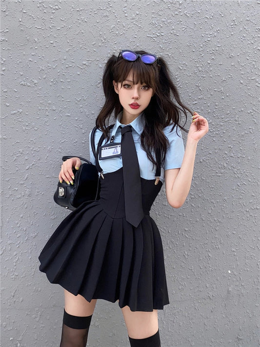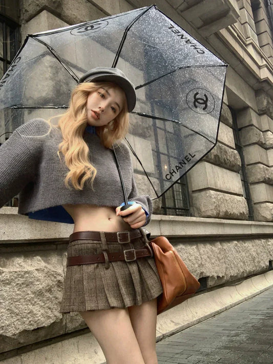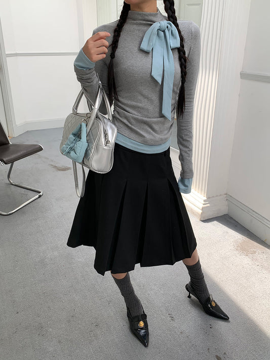 ブルーグレーのセーターとダブルベルトスカートのセット