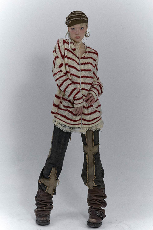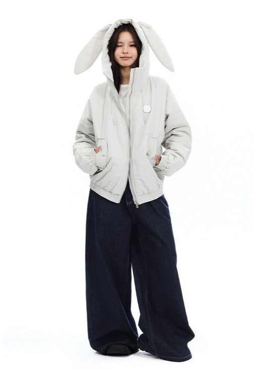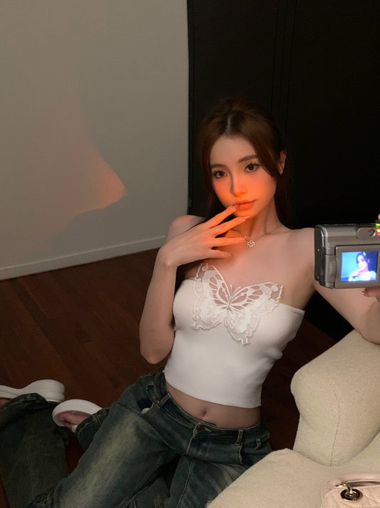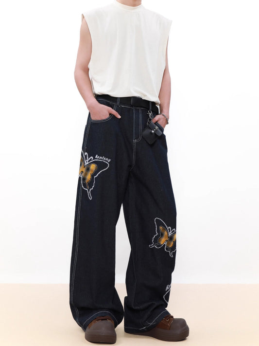 バタフライ刺繍ストレートレッグデニムジーンズ