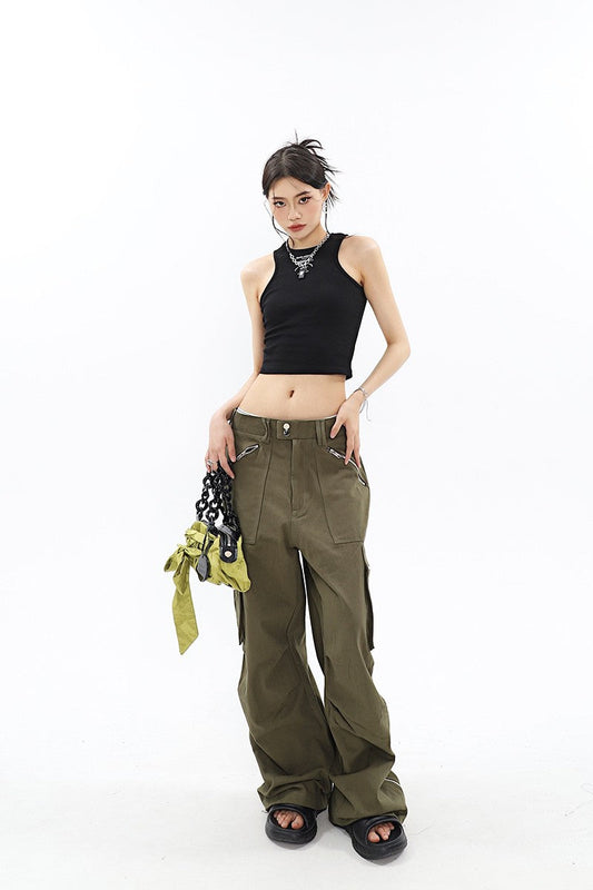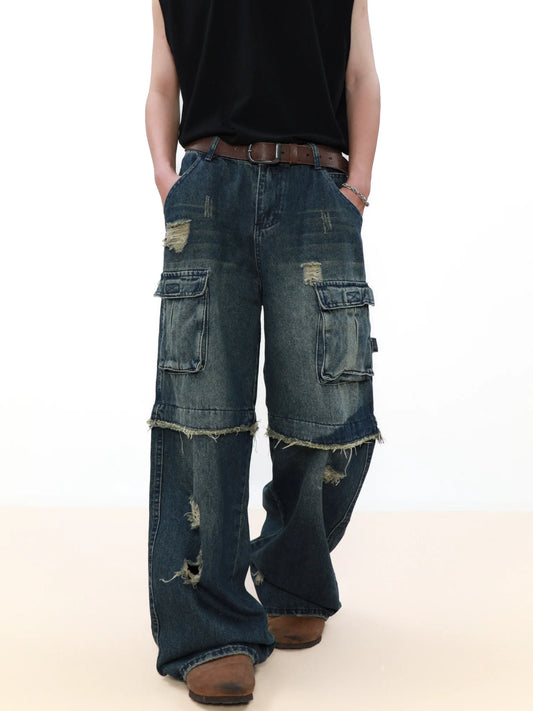 ダメージ加工 マルチポケット ストレートレッグ デニムジーンズ