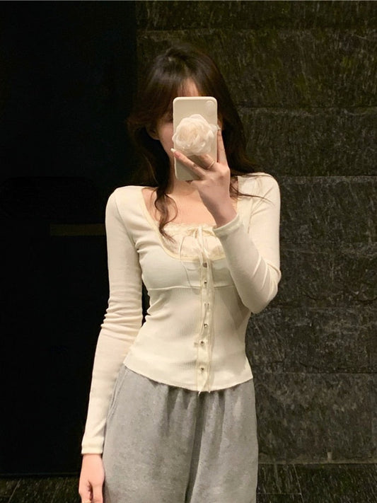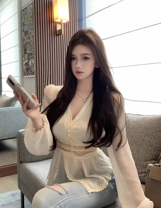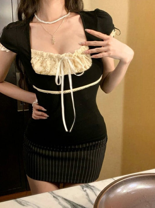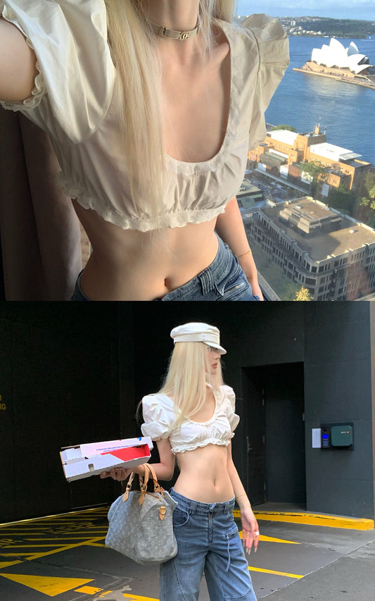 Lace Trim Lantern Sleeve Top & Shorts Set