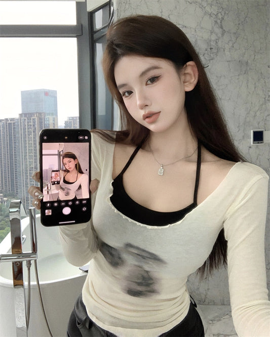レイヤードプリントロングスリーブトップス