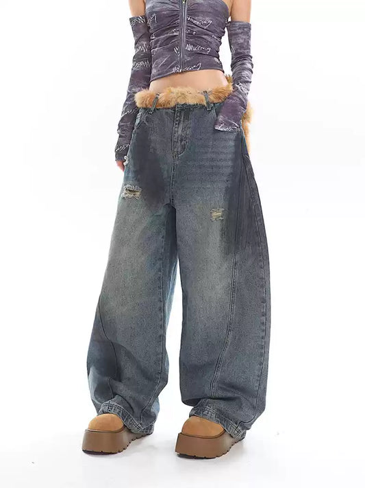 マルチポケットワイドレッグストレートカーゴデニムジーンズ