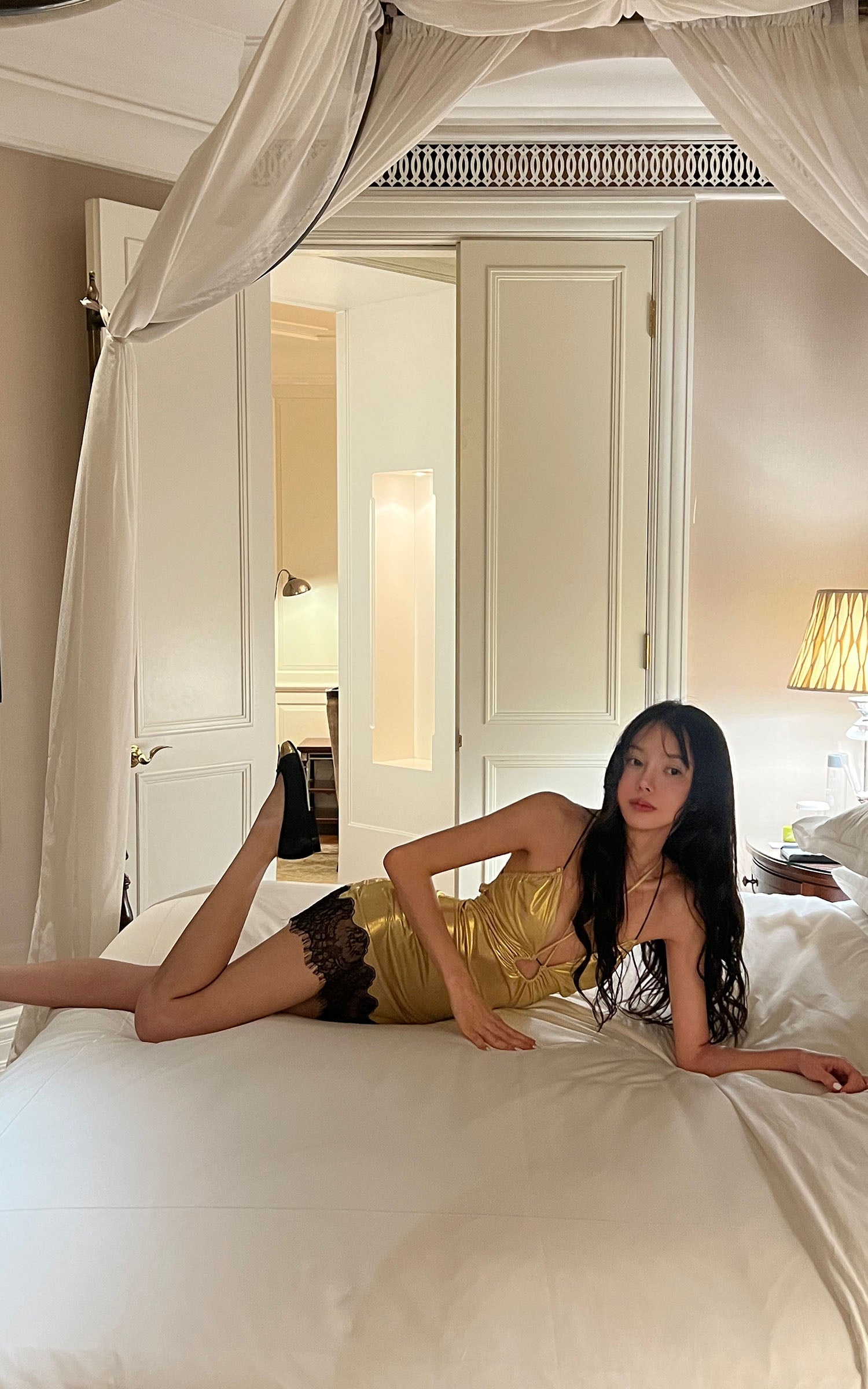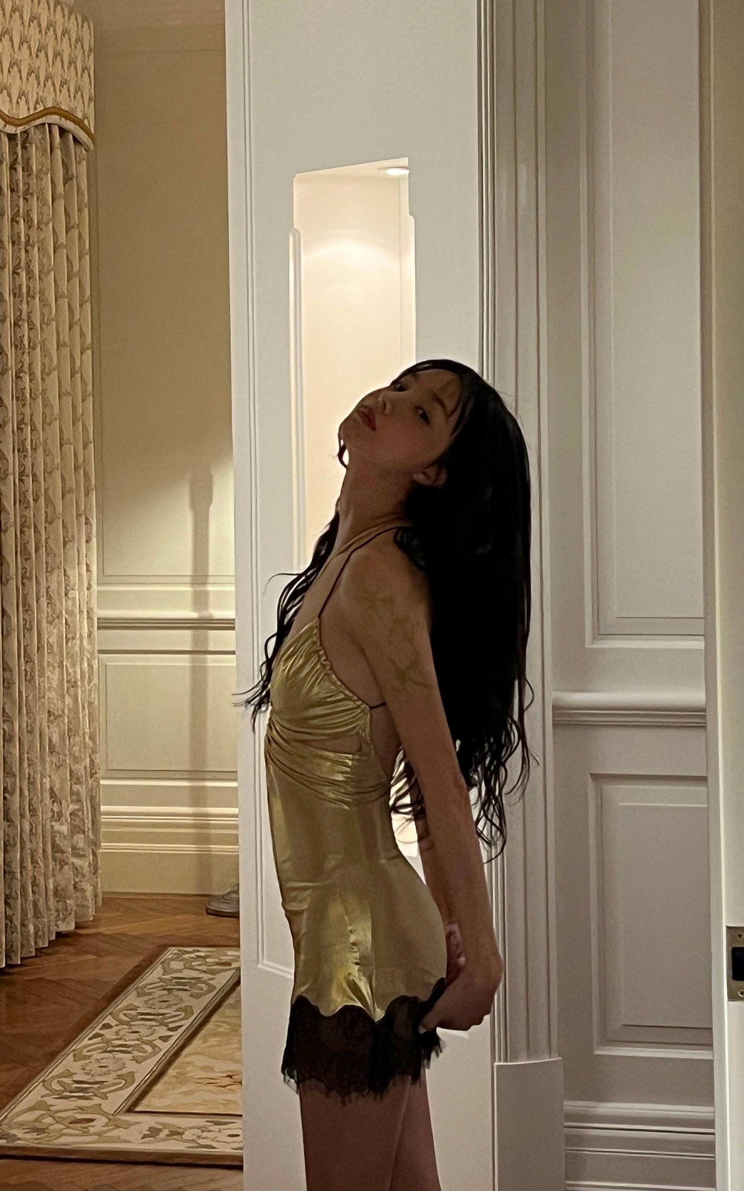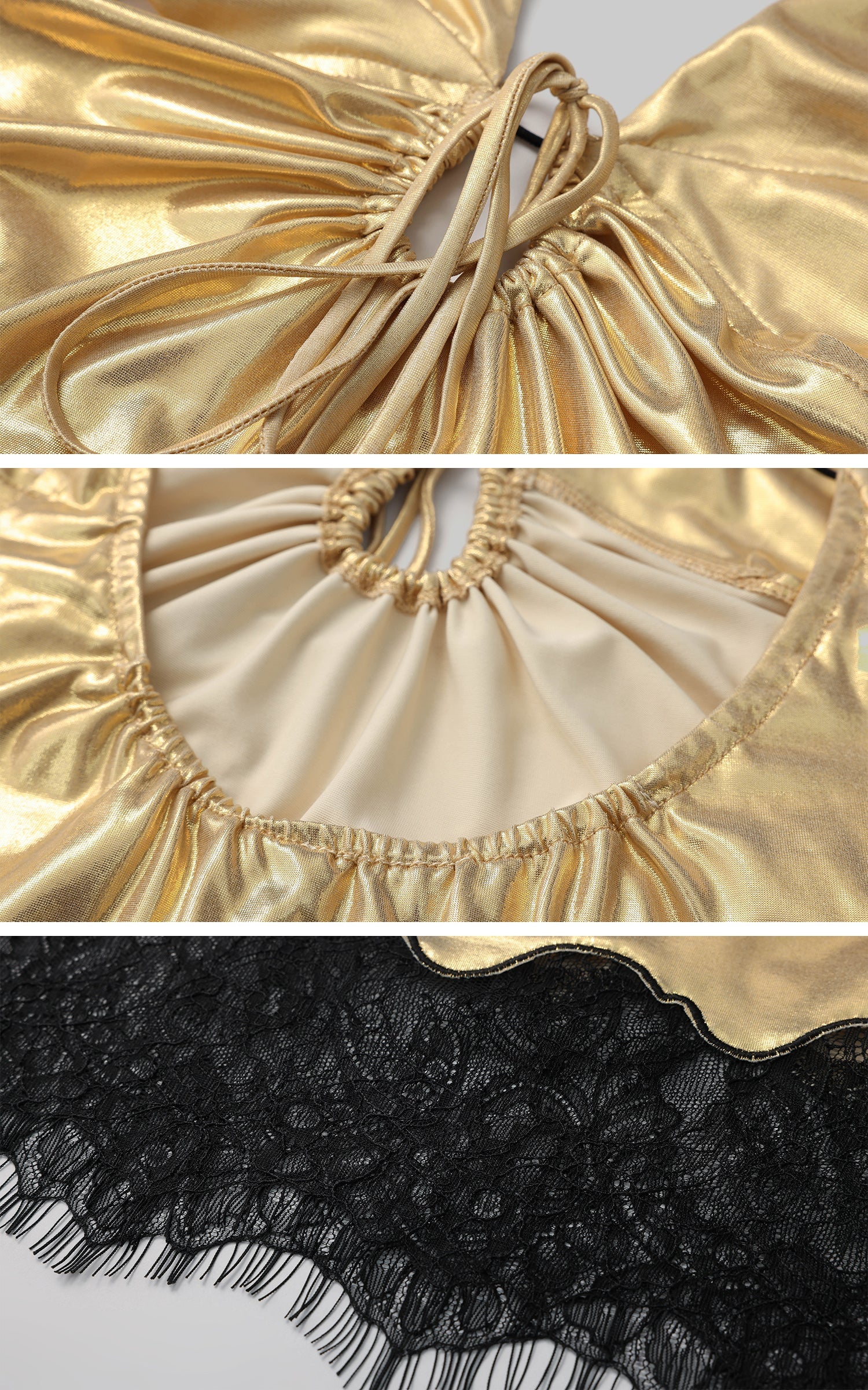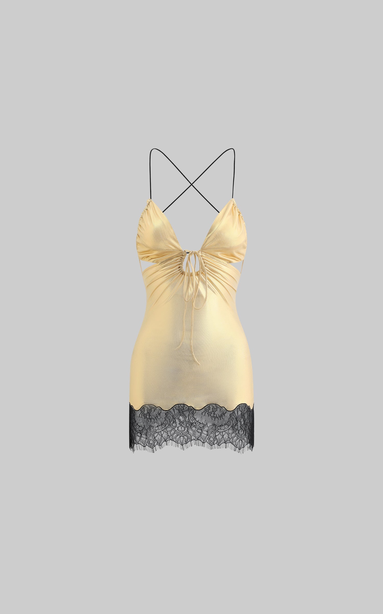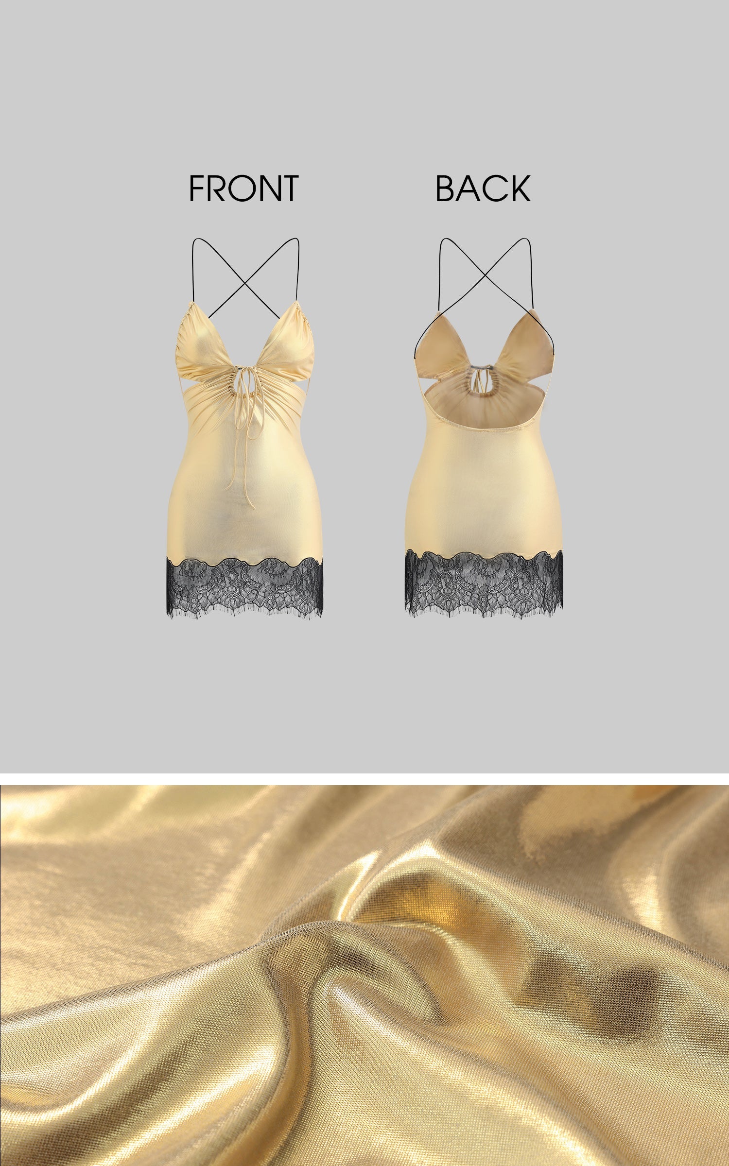 Slip into something a little more daring. This mini slip dress features a liquid-gold satin finish that catches every glimmer of light, hugging your silhouette with a barely-there touch. The ruched bust and peekaboo keyhole detail draw the eye in, while delicate black lace trim along the hem adds just the right amount of contrast. Finished with crisscross spaghetti straps and an open back, this piece is made for candlelit rooms, late-night whispers, and moments meant just for you.