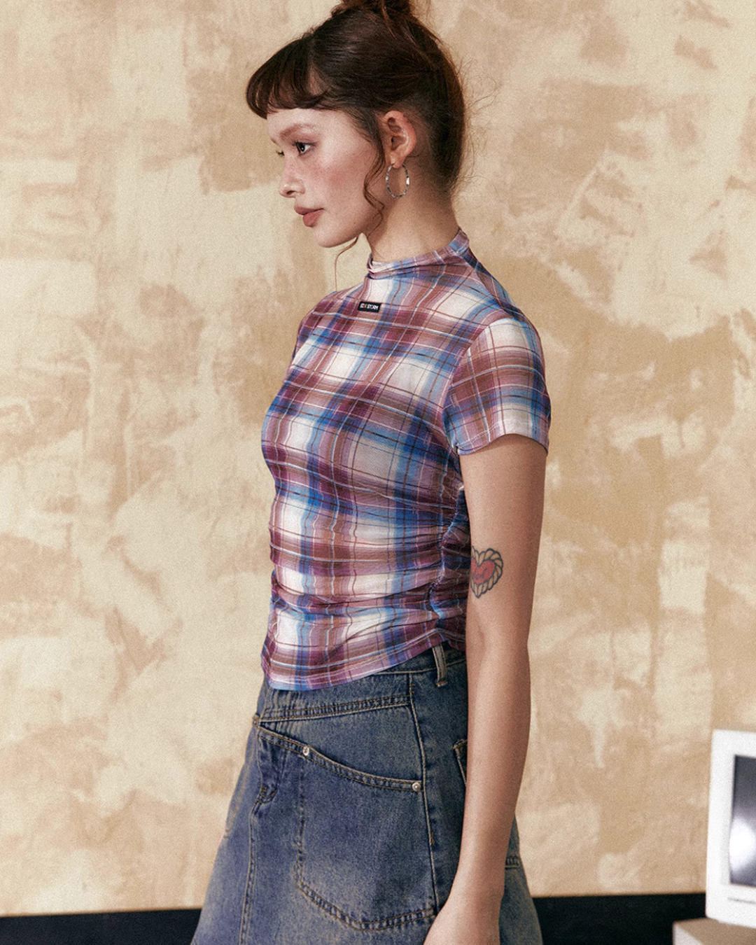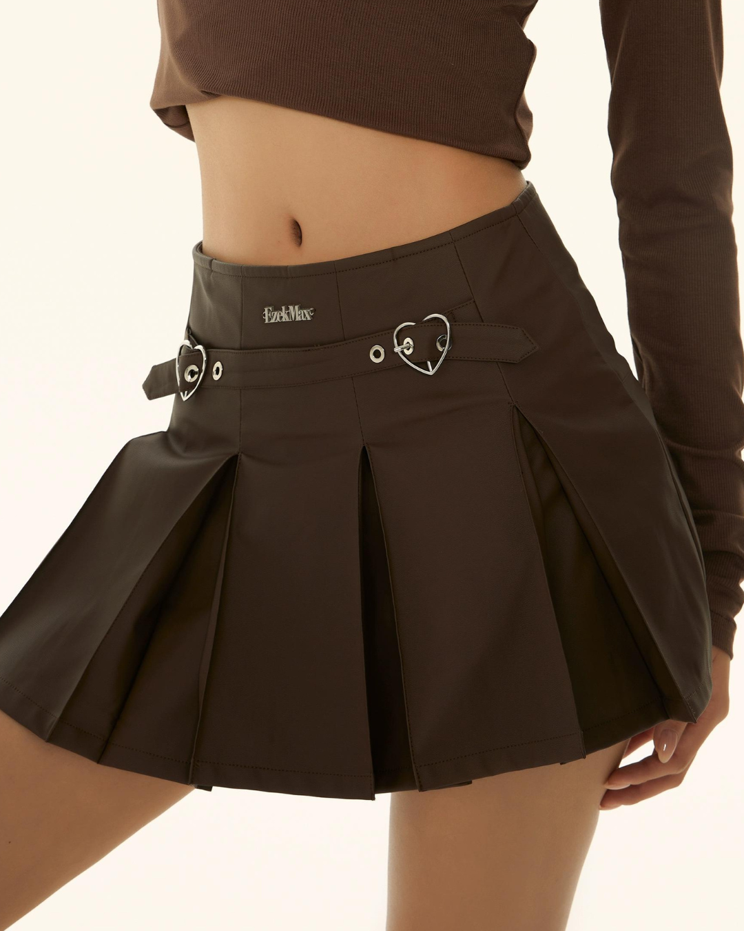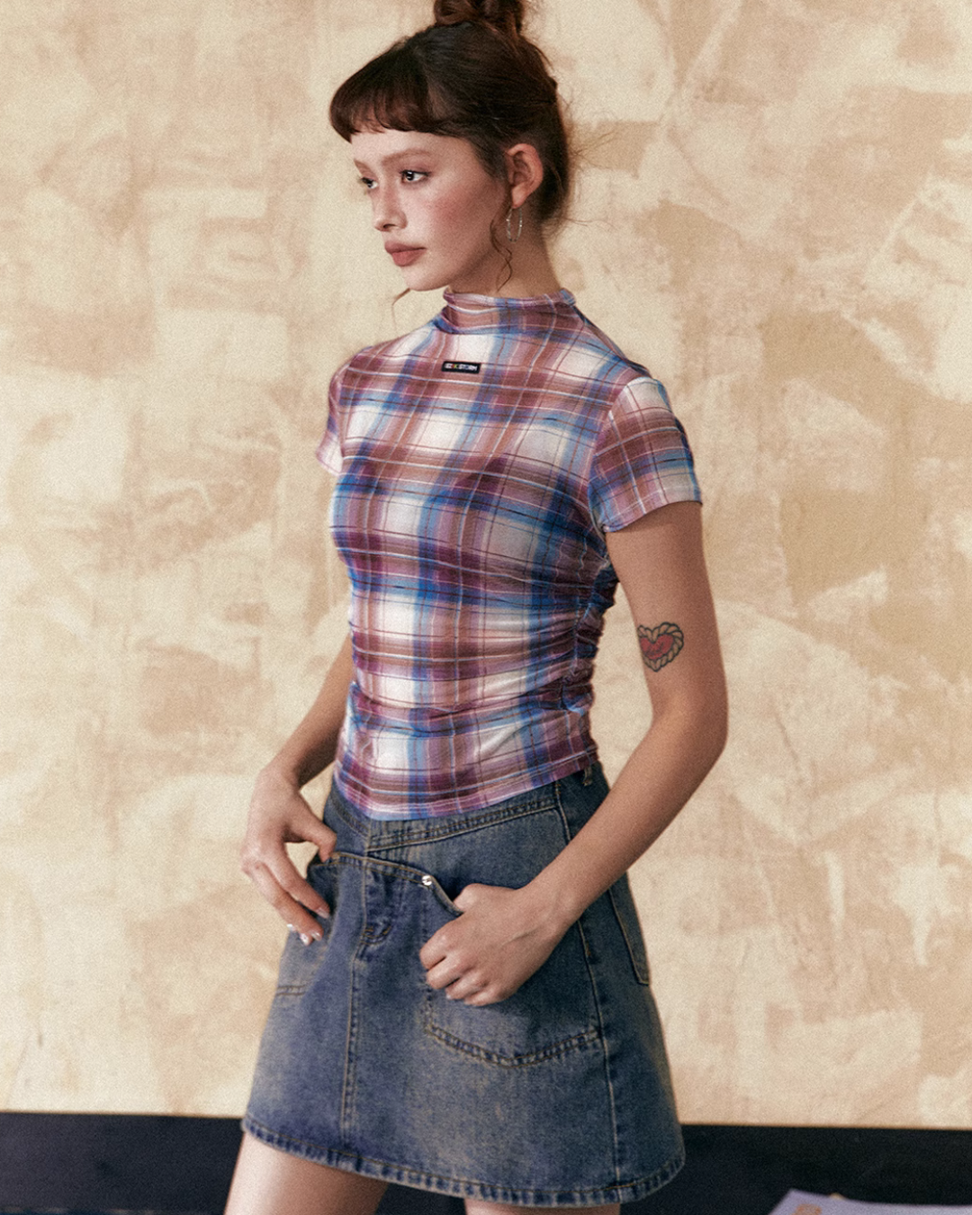 モックネックチェックトップス / ボックスプリーツスカート