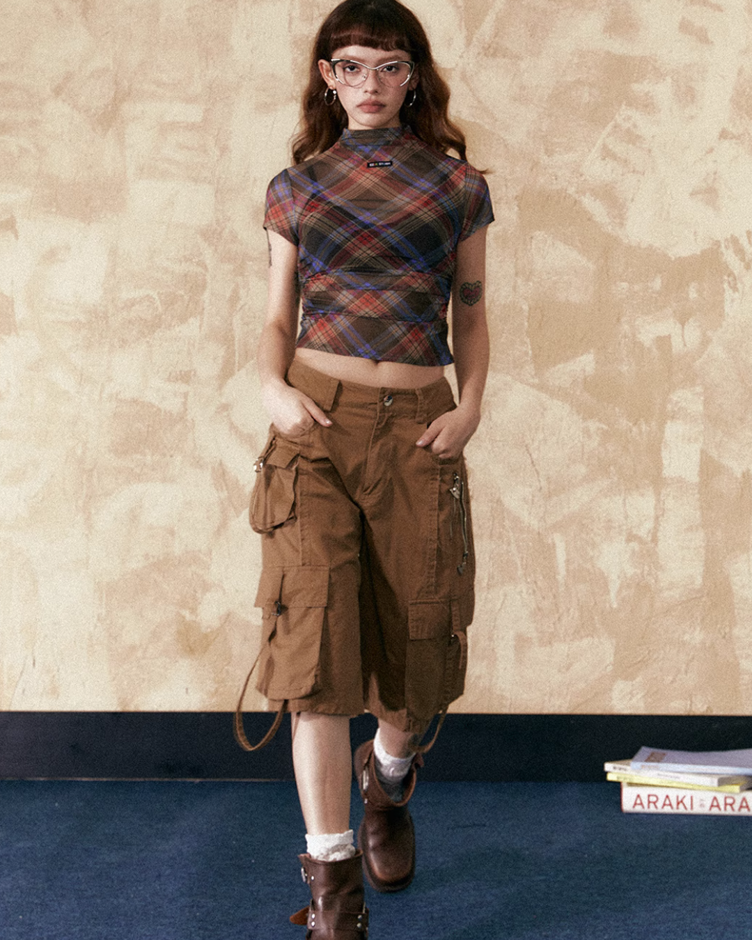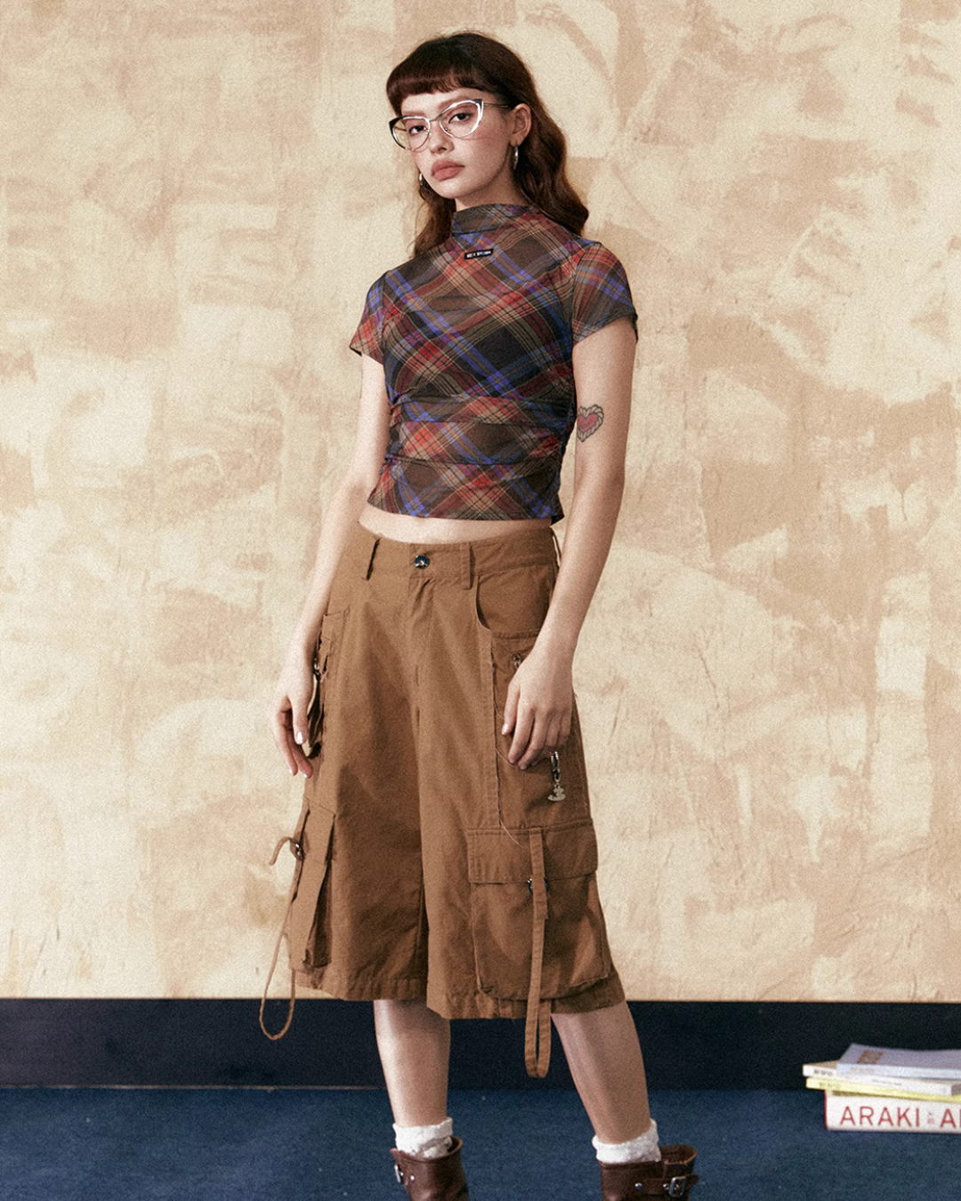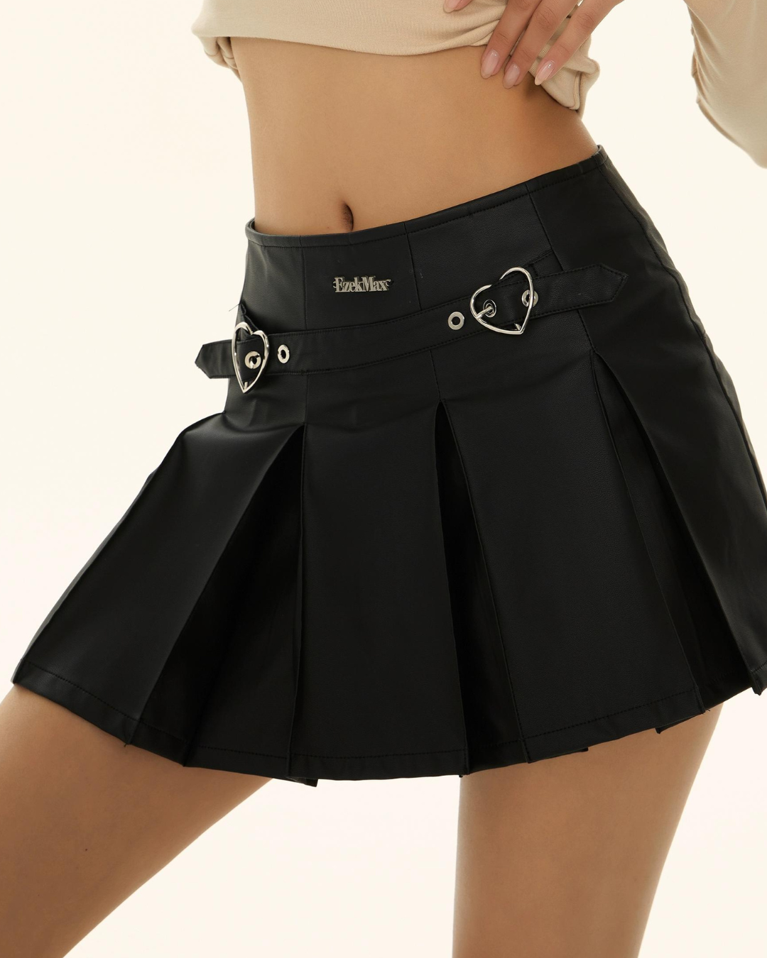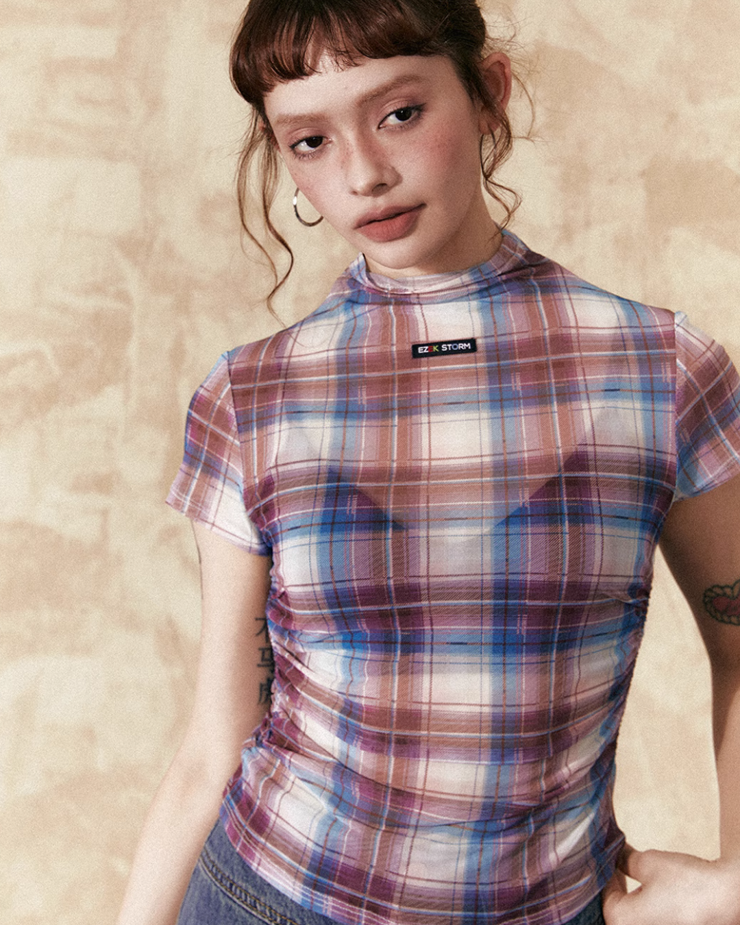 モックネックチェックトップス / ボックスプリーツスカート