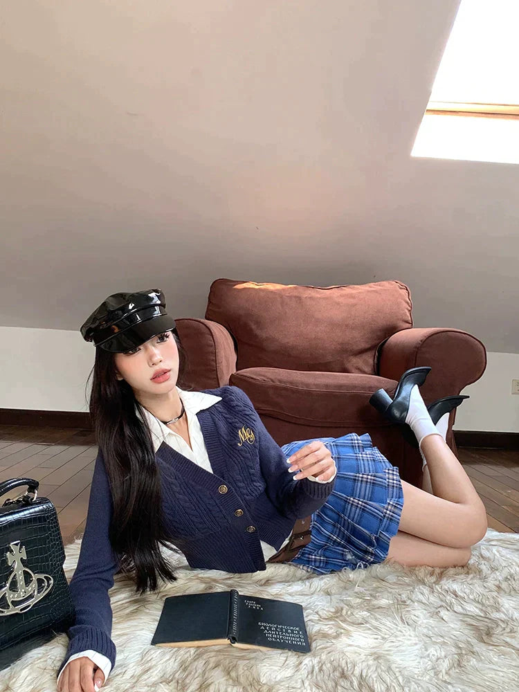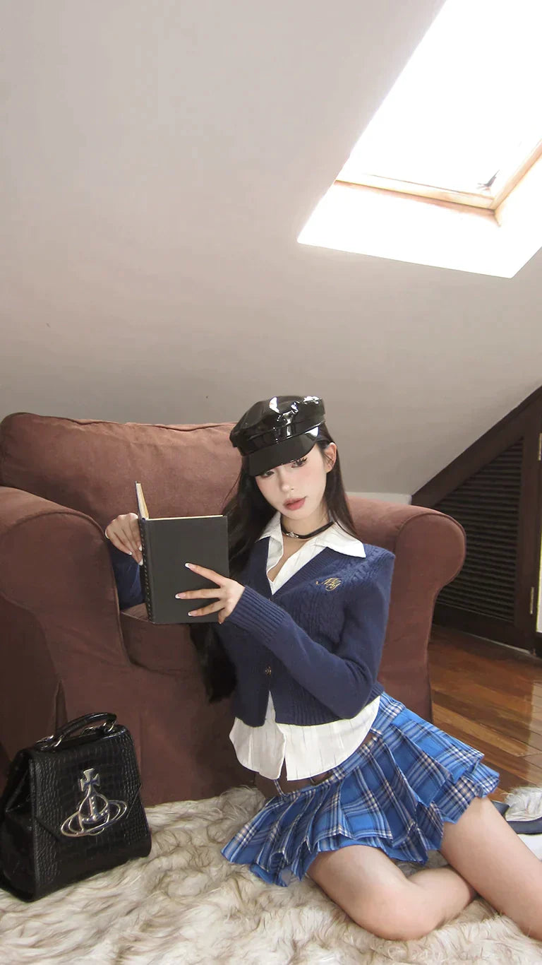 ネイビーカーディガンブラウス&ブルーチェックスカート+ベルト